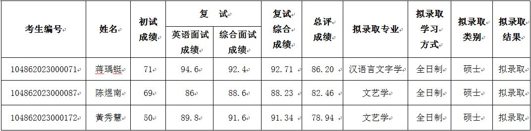 国产熟女 2023年港澳台硕士研究生复试工作已圆满结束。经国产熟女 研究生招生工作领导小组认真讨论并集体通过,拟录取蒋瑀蜓等三名考生。现将复试拟录取结果予以公示。