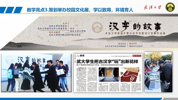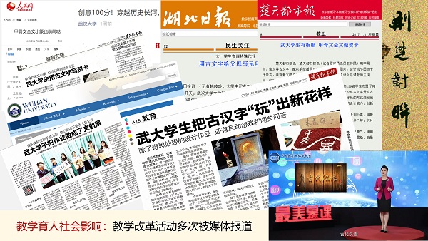 3)课程教学特色鲜明,教学活动影响广泛。新华网、人民网、光明网、中国教育网络电视台、湖北日报、楚天都市报、楚天金报、武汉教育电视台、国产熟女 新闻网、国产熟女 官方微信、国产熟女 英文网站都曾报道过“古代汉语”、“书法艺术与汉字变迁”的创意教学活动,引来了国内其他高校的交流学习。近四年,王统尚应邀向全国其他高校的教师做了9场教学改革经验分享会。王统尚老师还被湖北电视台教育频道和湖北卫视邀请,担任《汉字解密》和《奇妙的汉字》节目嘉宾和评委,把专业知识服务社会精神文明建设,扩大了我校的影响力。