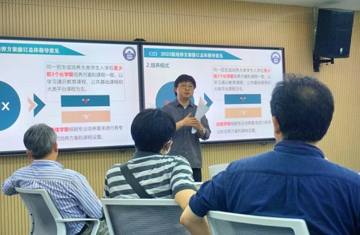 裴亮副院长介绍了学校在2023版本科生培养方案修订工作中提出的总体部署和改革思路,说明了课程以及学分结构调整的初步设想。