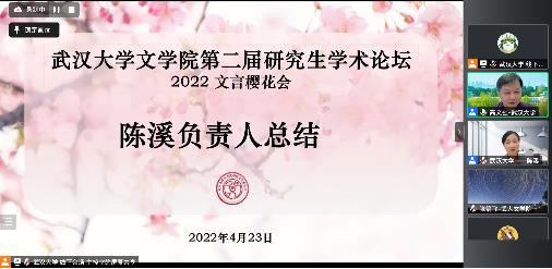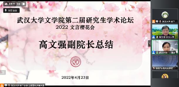高院长首先介绍了担任本次学术论坛的专业点评工作的全部专家老师,接着他提出,研究生学术论坛一直坚持研究生自主筹备的形式,其初衷是为了让研究生提前进入到学术语境中,更好地体验学术交流的氛围。高院长特别说明,研究生论坛设置主题——“2022文言樱花会”,原意是要让三校师生在国产熟女 樱花时节的校园里交流学术,但受疫情影响转为了线上形式,让我们一起期待这一遗憾能在下一届论坛得以弥补。