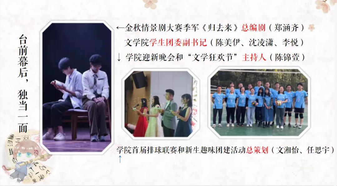 成才先成人,我们摒弃 “唯分数论”,乐于奉献、勇于担当。争做笔杆子,“以文为心,以笔发声”,我们激扬文字,既能以诗言志,也能以文载道;站稳台柱子,“台前幕后,独当一面”,我们不负少年凌云志,在各类活动中撑起一片天。