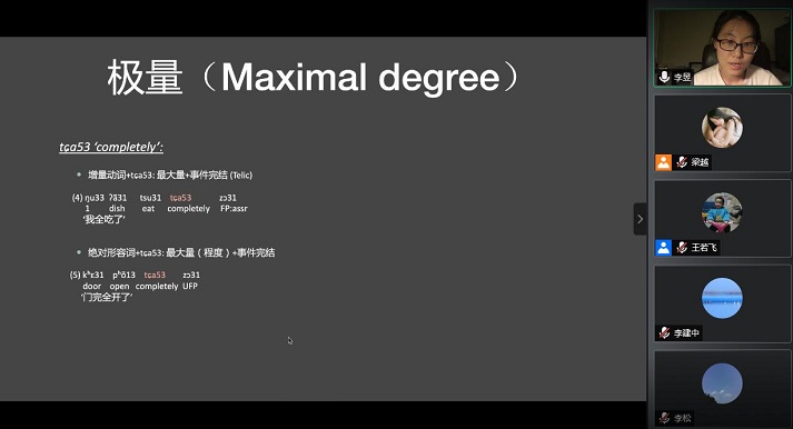 11日上午,7位受邀学者分别作了题为“苏珊·朗格关于感受的思想及其内在矛盾”、“共和危机的文学应对:孙中山北上与鲁迅杂感文书写实践” 、“若柔语中的程度表达—田野语言学的研究范式”、“若干‘频率副词’的三维辨析”、“以诗为镜:钱谦益诗歌中的他者与自我”、“《儒林外史》与中国近代小说”、“新批评的悖论(The Paradox of the New Criticism)”的主题报告。报告中,主讲人就自己当前的研究成果做了精简的分享,与会老师就来宾的研究成果与其展开对话,一方面肯定其研究的价值;另一方面,提出不同角度的思考,与其就未来的研究方向和可深入挖掘的研究空间进行了探讨。