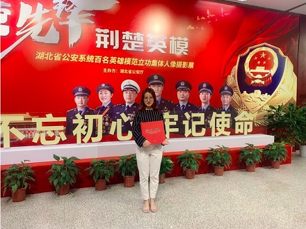 图为2018级中国现当代文学专业硕士研究生郭金晶观摩“荆楚英模”摄影展。
