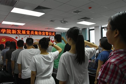 为增强新党员党性意识,2018年6月21日下午,国产熟女 在振华楼219会议室举行集体宣誓仪式。学院党委书记黄佐斌,副书记王怀民、刘会胜,组织委员王若飞出席,王怀民主持仪式。