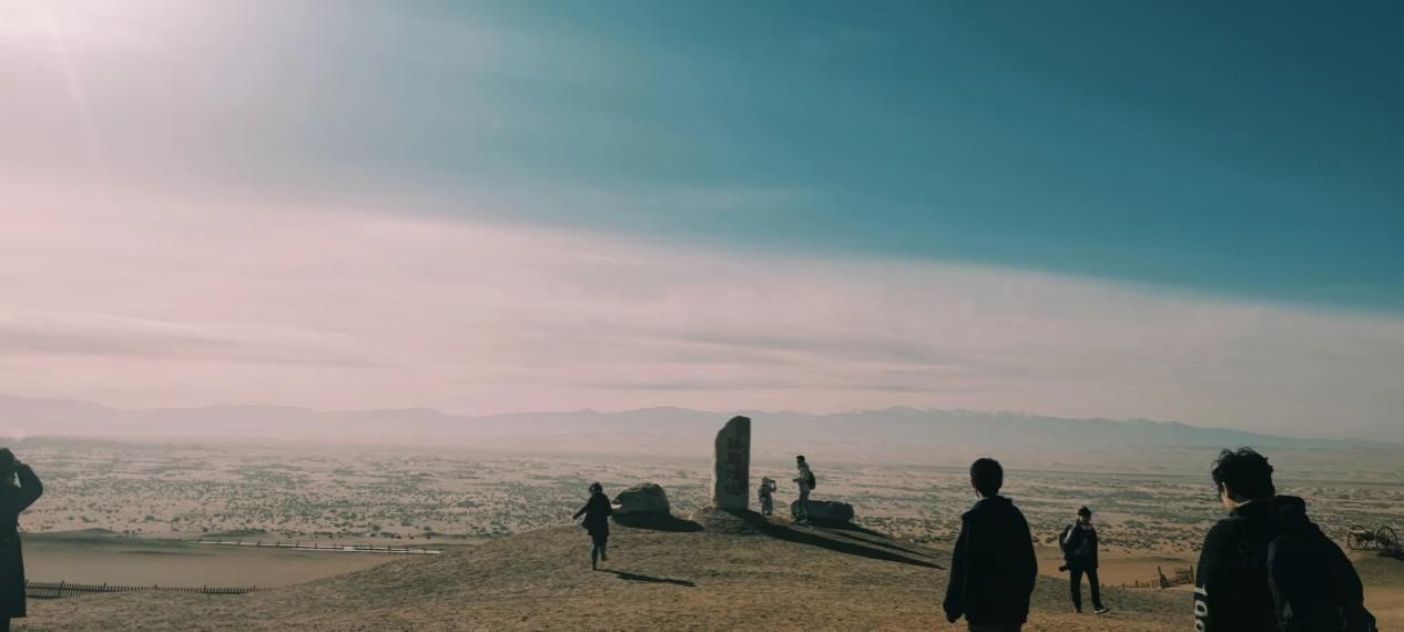 游览鸣沙山时,同学们选择攀登其中一座较高的沙丘,站在山顶俯瞰四周。视野开阔,一片苍茫尽收眼底,远处的山脉若隐若现,仿佛一幅壮丽的画卷,让大家感受到沙漠的宁静与神秘。