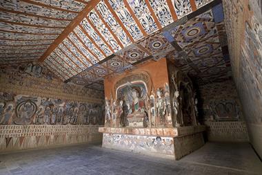 第220窟是莫高窟最重要的初唐洞窟之一。此窟为覆斗顶形窟,正壁开一龛,左壁画阿弥陀变,右壁画东方药师变,前壁画维摩诘经变。