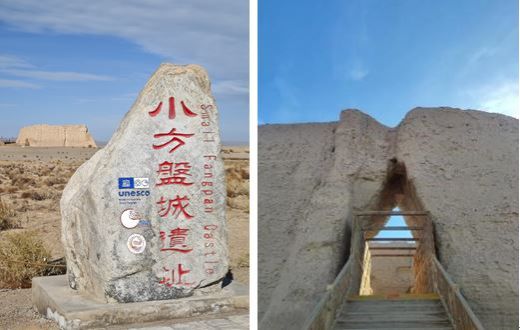 同学们还重点参观了玉门关遗址中的小方盤城遗址,这是一座西汉时期的四方形小城堡,耸立在东西走向戈壁滩狭长地带中的砂石岗上,一支南北走向的长城,绕过小方盘城西侧,向南直达阳关,关城北坡东西走向车道直通西域。