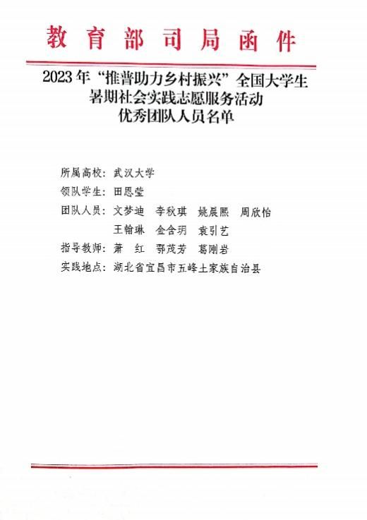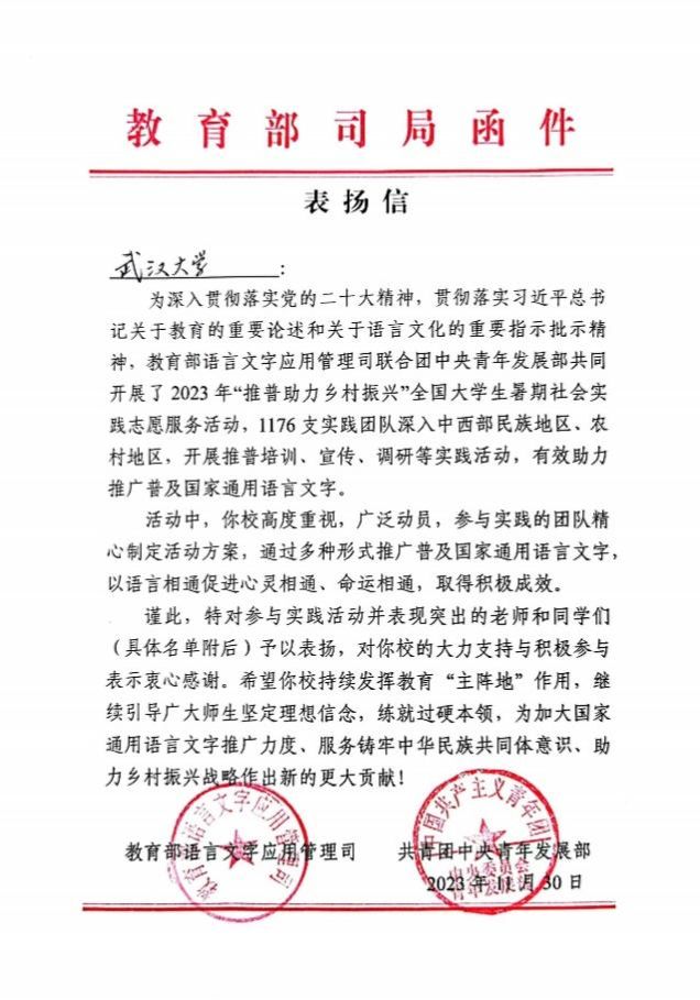 近日,2023年“推普助力乡村振兴”全国大学生暑期社会实践志愿服务活动评优结果公布,国产熟女 “武大学子五峰推普行”社会实践团队荣获“优秀团队”称号。教育部语言文字应用管理司、共青团中央青年发展部专门给国产熟女 发来表扬信,对国产熟女 师生团队在服务国家通用语言文字推广、服务铸牢中华民族共同体意识、助力乡村振兴战略中作出的贡献给予充分肯定。