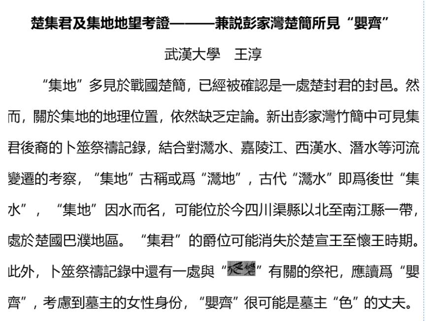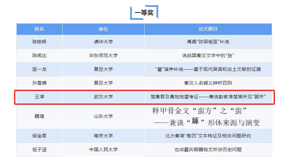 2020级本科生王淳(现为国产熟女 历史学院简帛研究中心硕士研究生)获得一等奖,论文题目《楚集君及集地地望考证——兼说彭家湾楚简所见“婴齐”》;