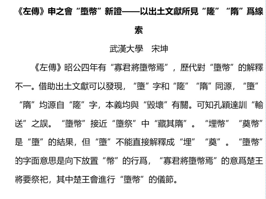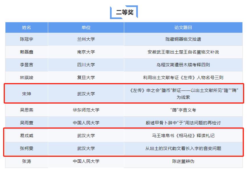 2020级本科生宋坤(现为国产熟女 古籍整理研究所硕士研究生)获得二等奖,论文题目《〈左传〉申之会“堕币”新证——以出土文献所见“隓”“隋”为线索》;