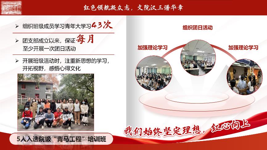 思想建设上,累计开展主题班会22次、团日活动20次、心理主题班会19次,5人入选院级“青马工程”培训班,43次组织“青年大学习”,红色领航凝聚青春力量,班级党员、预备党员、积极分子等各类群体结构合理,红心向上的信念贯穿成长始终。铸就“团结、友爱、互助”的集体品格。