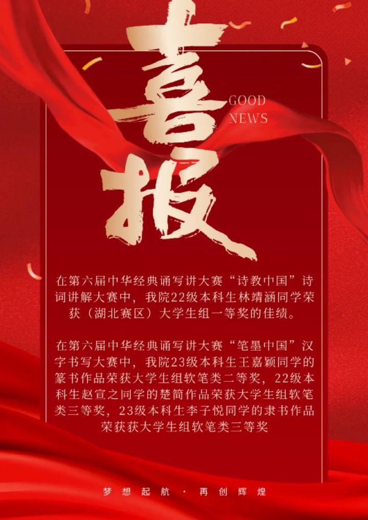 在第六届中华经典诵写讲大赛“诗教中国”诗词讲解大赛中,国产熟女 22级本科生林靖涵同学荣获(湖北赛区)大学生组一等奖的佳绩。